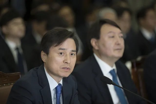 위산진은 2017년 10월 국회 법제사법위원회 국정감사가 열린 23일 오후 서울 서초구 서울고검에서 조은석 서울고검장이 질의에 답변하고 있는 모습. 옆자리에는 당시 윤석열 서울중앙지검장.