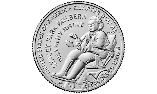 동전의 둥근 테두리를 따라서는 ‘DISABILITY JUSTICE’(장애인의 정의)라는 문구와 밀번의 이름인 ‘Stacey Park Milburn’이 쓰여 있다.