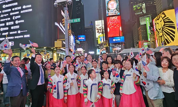 한편 뉴욕한인회와 미주한인이민사박물관, 충남콘텐츠진흥원은 이날 오후 8~9시 맨하탄 타임스스퀘어 대형 전광판에 유관순 열사 등 순국선열들의 독립운동과 그 발자취를 영상으로 소개하는 행사를 가졌다.광복 80주년을 맞아 맨하탄 타임스스퀘어 LED 대형 전광판 앞에서 대한민국 독립운동의 역사를 전 세계에 알리기 위한 영상이 15일 오후 8~9시 1시간 동안 상영됐다. 이날 행사에는 뉴욕한인청소년합창단 등 한인들이 참석해 그날의 감동을 대한독립만세 삼창으로 재현했다. (맨위 사진)