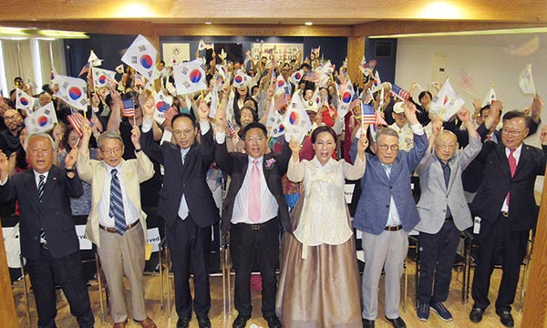뉴욕한인회와 뉴욕총영사관, 대한민국 광복회뉴욕지회, 민주평화통일자문회의 뉴욕협의회, 충남콘텐트진흥원은 공동으로 15일 뉴욕한인회관에서 독립 유공자 후손 등 광복회원, 한인사회 각계 인사 등 200여명이 참석한 가운데 ‘80주년 광복절 경축식’을 거행했다. 사진은 15일 뉴욕한인회관에서 거행된 80주년 광복절 기념식에서 참석자들이 대한민국광복회 뉴욕지회 허경화 이사장의 선창에 따라 만세삼창을 하고 있는 모습.