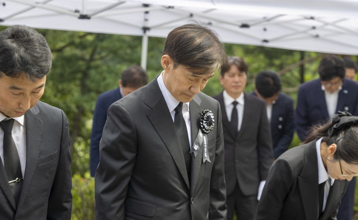 사진은 조국 전 조국혁신당 대표가 김대중 전 대통령 서거 16주기인 18일 서울 동작구 국립서울현충원 김 전 대통령 묘역에서 참배하고 있는 모습.
