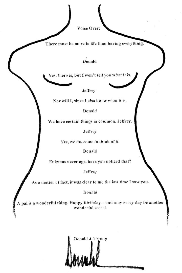 해당 메모와 그림은 2003년 엡스타인의 50번째 생일 선물로 전달된 것으로, 지난 8일 미 의회에 의해 공개됐다. 트럼프 대통령은 메모 작성에 관여하지 않았다고 주장했으며, 백악관은 이를 조작이라고 밝혔다.