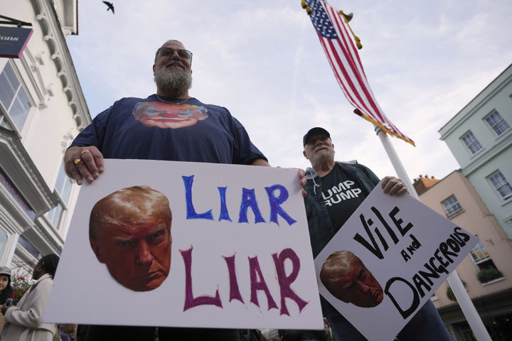 영국 윈저에서 도널드 트럼프 미국 대통령의 방문에 반대하는 시위대가 각종 손팻말을 들고 있다.
