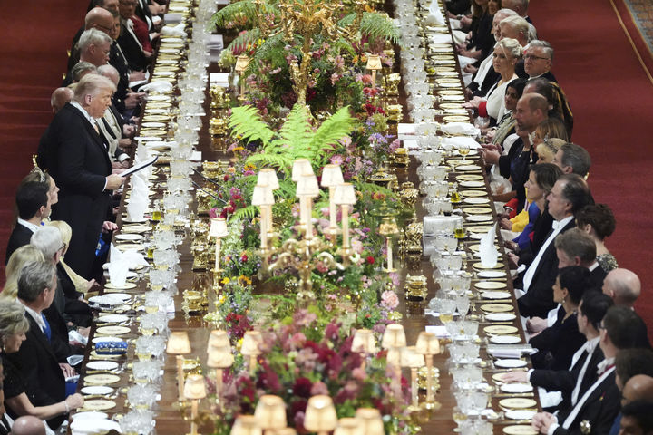 윈저성 세인트조지 홀에서 열린 이날 만찬에는 160명의 귀빈을 수용할 수 있는 축구장 절반 길이의 워털루 테이블이 동원됐다. 200년 이상 된 은제 식기 등 식기 1452점이 트럼프 대통령을 비롯한 귀빈 대접에 사용됐다.