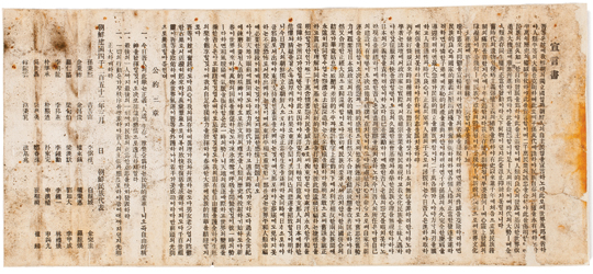 <아아 新天地가 眼前에 展開되도다. 威力의 時代가 去하고 道義의 時代가 來하도다. (새로운 시대가 눈 앞에 펼쳐지도다. 위력의 시대가 가고 도의의 시대가 오도다.) >