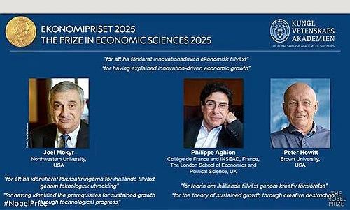 스웨덴 한림원은 13일, 올 노벨 경제학상 수상자로 ‘혁신 중심의 경제성장을 창조적 파괴 개념 등을 통해 잘 설명해온’ 3명의 학자를 공동수상자로 선정 발표했다.