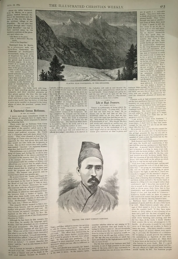 지금부터 150년 전인 1884년 1월 당시 미국내 최고 발행부수와 판매를 자랑하던 기독교 주간지인 ‘일러스트레이티드 크리스천 위클리’ ‘ (The Illustrated Christian Weekly)의 1월호에 동양에서 온 한 편지가 실렸다.