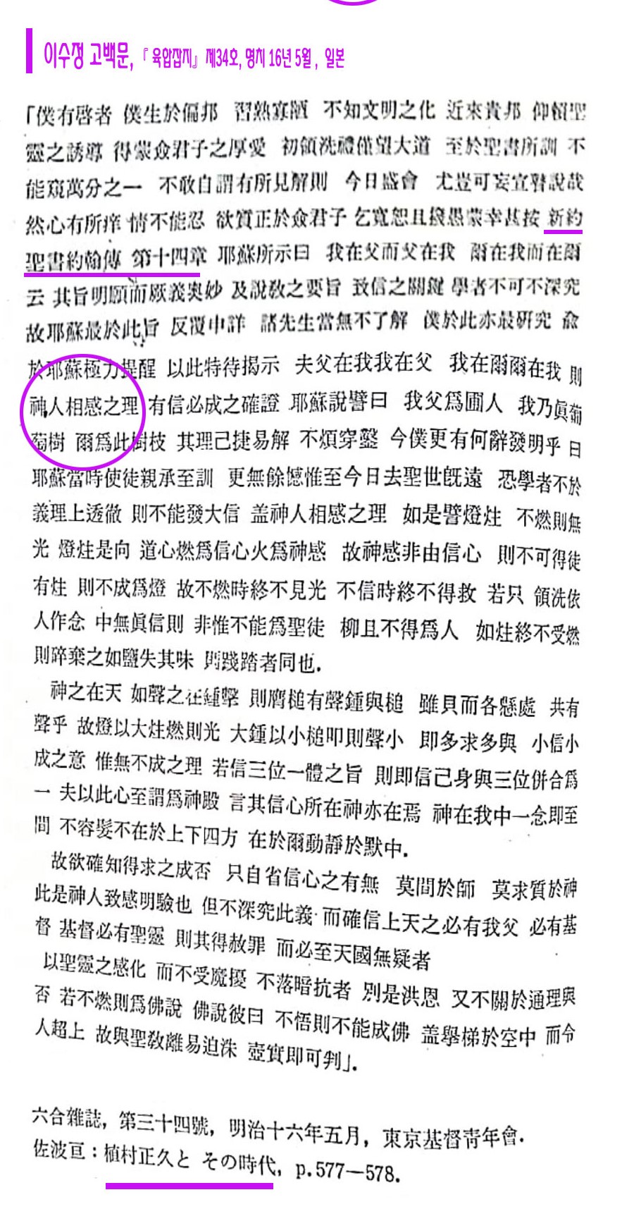 이 글에서 그는 요한복음을 원용해 “내가 아버지 안에 있고 너희가 내 안에 있다”고 하신 것은 “하나님과 사람이 서로 감응의 일치가 있음을 말씀하신 것으로서 이것은 믿음으로 이루어진다는 것을 확증한 것”이라고 말해 ‘신인상감(神人相感之理) ‘ 의 깊은 유교적 소양을 드러 냈고 또 개신교와 천주교, 좁게는 감리교와 장로교 간의 논쟁이 되고 있는 이신칭의와 성화 문제 그리고 예정조화설의 문제 까지 짚어 내면서 자신의 견해를 피력했다. 세례 받은지 두달 밖에 되지 않은 신자로서는 도저히 할 수 없는 대단한 일이다. 더욱이 그 시기에.