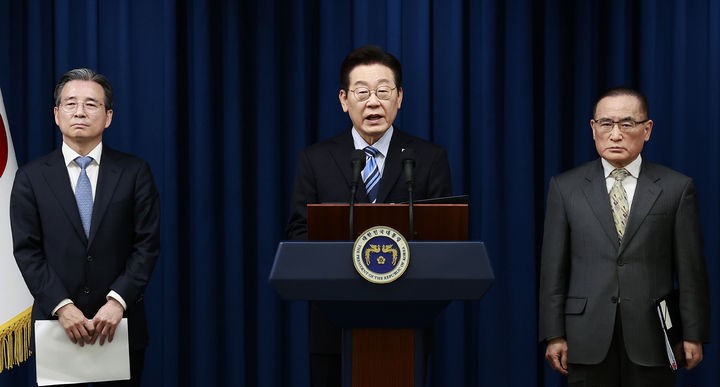 위 사진은 이재명 대통령이 14일 서울 용산 대통령실에서 한·미 간 관세·안보 합의를 문서화하는 ‘조인트 팩트시트(JFS·합동설명자료)’ 관련 발표를 하고 있는 모습. 왼쪽부터 김용범 정책실장, 이 대통령, 위성락 국가안보실장.