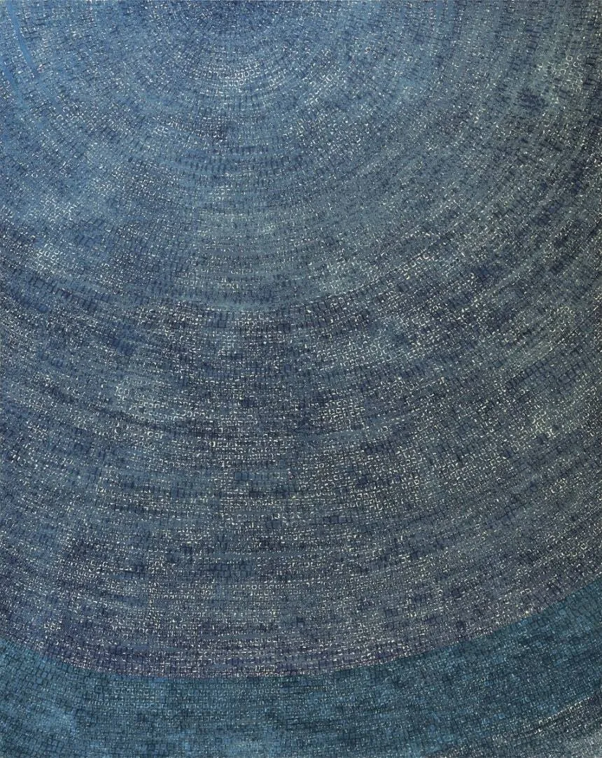 가로 254㎝, 세로 203㎝의 대형 전면점화인 ‘19-VI-71 #206’은 화면 전체를 푸른 점으로 채워 우주적 확산감을 만든다. 하단의 에메랄드빛 띠는 한층 깊은 색조를 이루며 작품의 초월적 분위기를 강화한다.