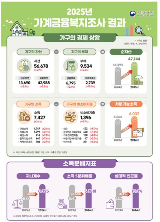 4일 국가데이터처와 한국은행·금융감독원이 공동 발표한 ‘2025년 가계금융복지조사 결과’에 따르면, 올해 3월 말 가구의 평균 자산은 5억6678만원으로 전년 대비 4.9% 증가했다. 자산은 금융자산 24.2%(1억3690만원)와 실물자산 75.8%(4억2988만원)로 구성됐다. 금융자산은 2.3% 올랐고, 실물자산은 5.8% 증가했다.