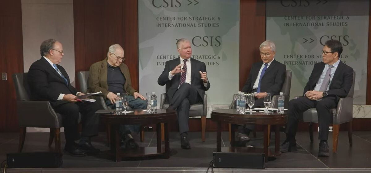 위 사진은 시드니 사일러 CSIS 선임고문, 로버트 갈루치 조지타운대 석좌교수, 스티븐 비건 전 국무부 부장관, 조병제 전 국립외교원장, 전봉근 국립외교원 명예교수(왼쪽부터)가 3일(현지시간) 워싱턴에서 열린 ‘제10차 KF-CSIS 한미전략포럼’에서 토론하고 있는 모습.