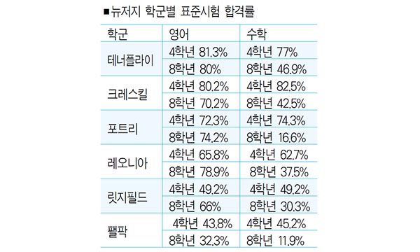 뉴저지주교육국에 따르면 2025년 표준시험 결과 뉴저지 전체 학생의 합격률 평균은 영어 53%, 수학 41%로, 코로나19 사태 이전인 2019년의 영어 57.6%, 수학 44%보다 낮은 것이다.