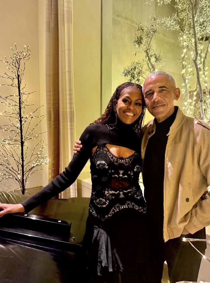 사진에는 오바마 부부가 황금빛 크리스마스 조명을 배경으로 환하게 웃고 있는 모습이 담겼다.