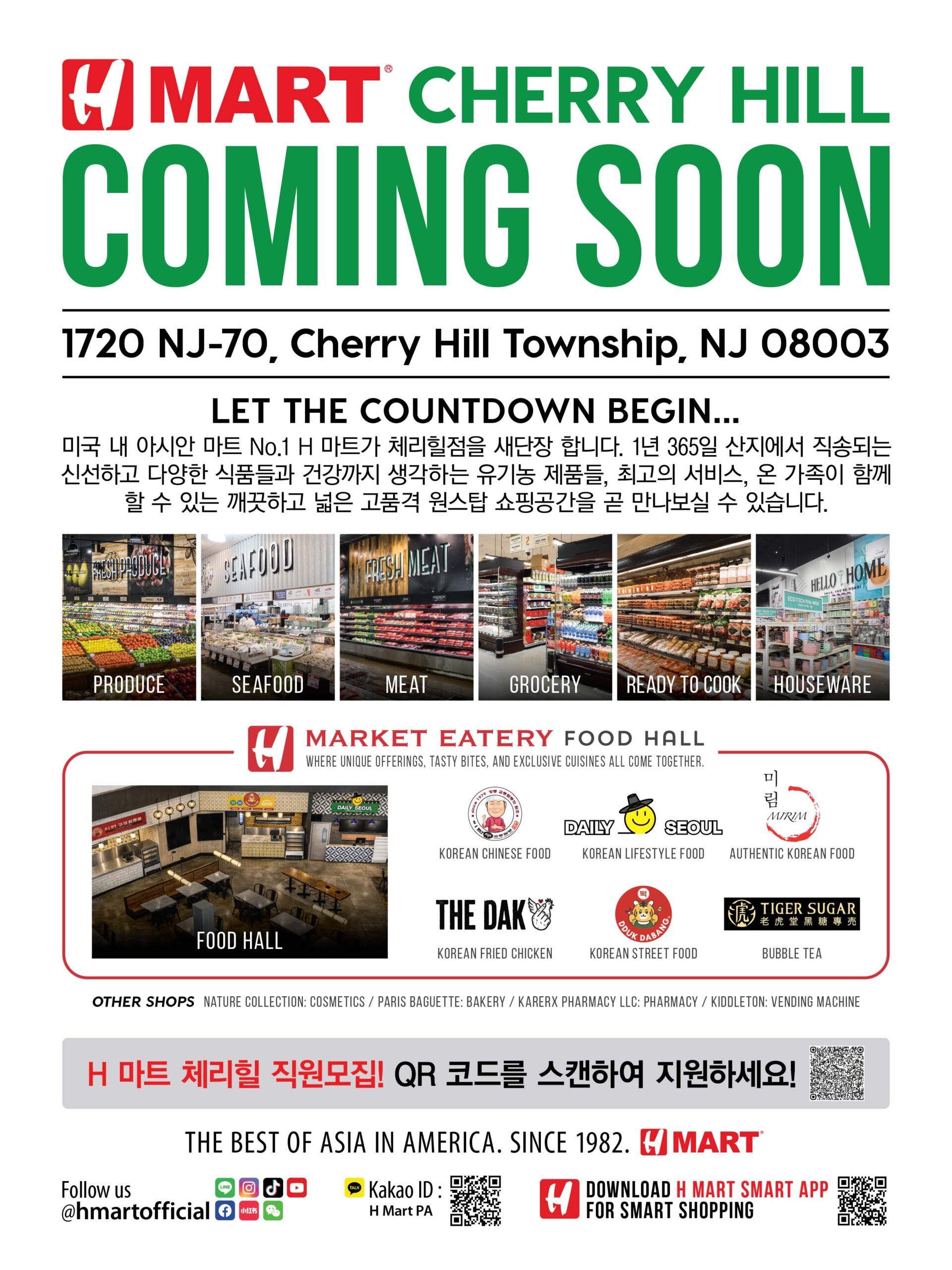 H 마트 브라이언 권 사장은 “뉴저지 체리힐 지역 주민들에게 아시아 본토의 풍성한 맛과 문화를 다시 선보이게 되어 매우 기쁘다”며 “H 마트를 찾는 모든 고객들이 아시아 각국의 다양한 식문화를 경험하고, 가정에서도 손쉽게 아시아 요리를 즐길 수 있도록 최선을 다하겠다”고 전했다체리힐점 푸드홀에는 한국식 중화요리 전문점 교동짬뽕, 한식 라이프스타일 푸드 브랜드 데일리서울, 정통 한식 전문점 미림, 한국식 치킨 전문점 더 닭(The Dak), 한국 스트리트 푸드 브랜드 떡다방, 대만식 버블티 브랜드 타이거 슈가(Tiger Sugar) 등 총 6개 브랜드가 입점해 다채로운 미식 경험을 선사할 예정이다.