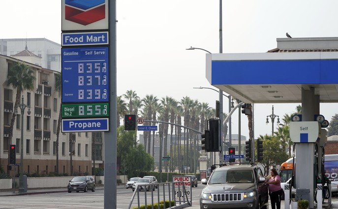 위 사진은 2022년 10월6일 미 캘리포니아주 로스앤젤레스의 한 주유소에 휘발윳값이 갤런당 8달러 이상으로 고시돼 있는 모습. 현재 상화은 아니다.
