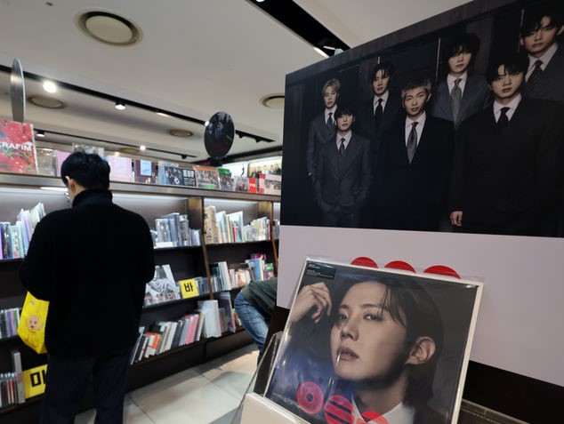 맨 위 사진은 서울 종로구 교보문고 광화문점 음반 판매장에 방탄소년단(BTS) 정규 5집 아리랑 앨범이 진열돼 있는 모습. 요즘엔 다시 화보집이 들어 있는 씨디와 함께 전통의 바이닐 엘피가 다시 각광을 받고 있다. 물론 인터넷을 통한 음원 구매도 집계에 포함 된다. (안지영기자)